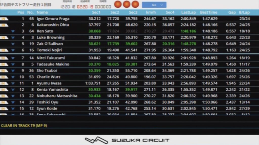 開始42分、野尻智紀 (MUGEN) が1.49.808で2番手、イゴール・オオムラ・フラガ (NAKAJIMA) が1:49.894で3番手に浮上。さらに開始45分、坪井翔 (TOM‘S) が1:49.763で2番手に浮上した。それでも、トップタイムの佐藤蓮 (NAKAJIMA) とは1.052秒の差がある。